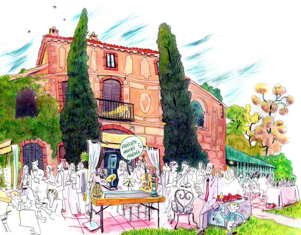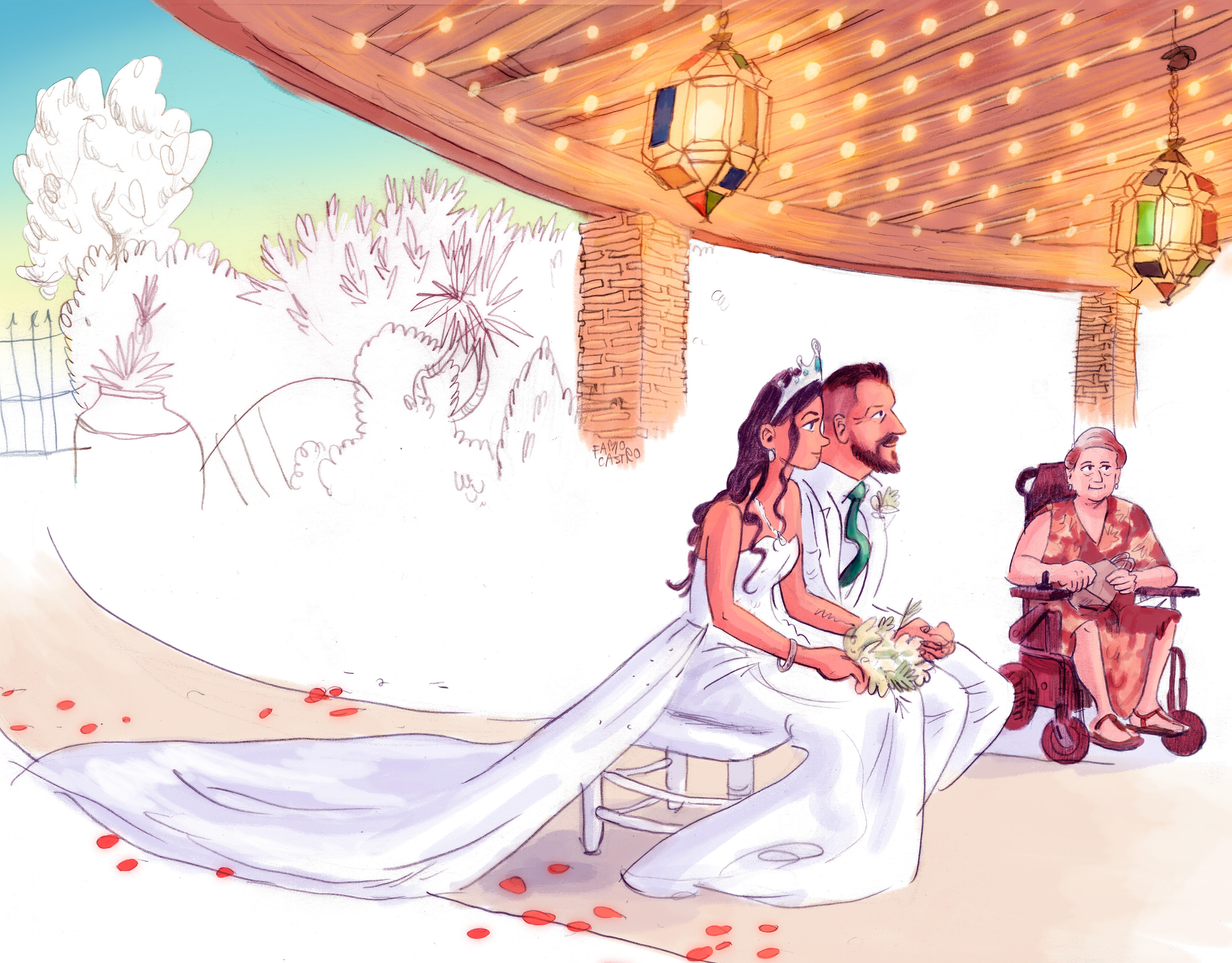 Sí, me transformo en regalo de bodas sorpresa. Me llevo mis libretas y dibujo en directo las escenas más emblemáticas (ceremonia, cocktail, fiesta...). Suele despertar la curiosidad de los invitados ver a alguien dibujando y yo siempre agradezco un poco de charla con quien se acerca a mirar. Durante los siguientes días doy color en digital en el estudio y entrego las ilustraciones impresas con tintas de alta calidad en papel 100% en packaging rígido y elegante.