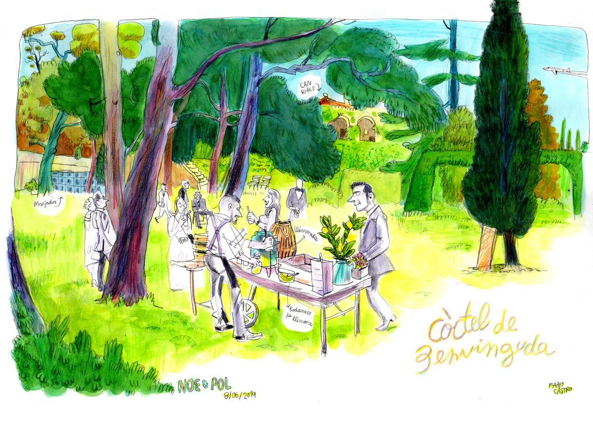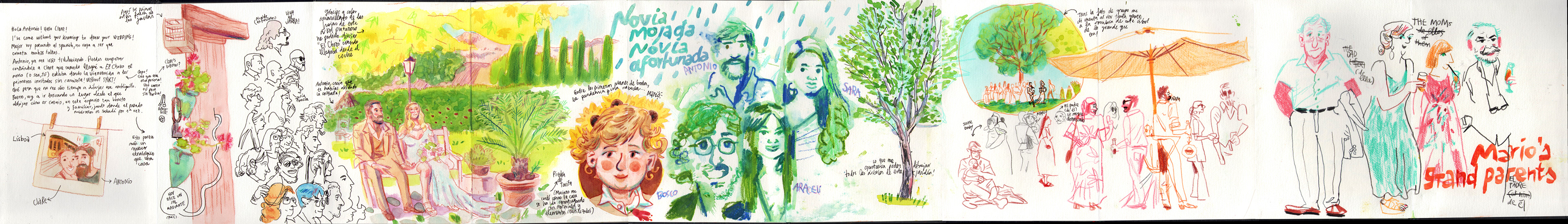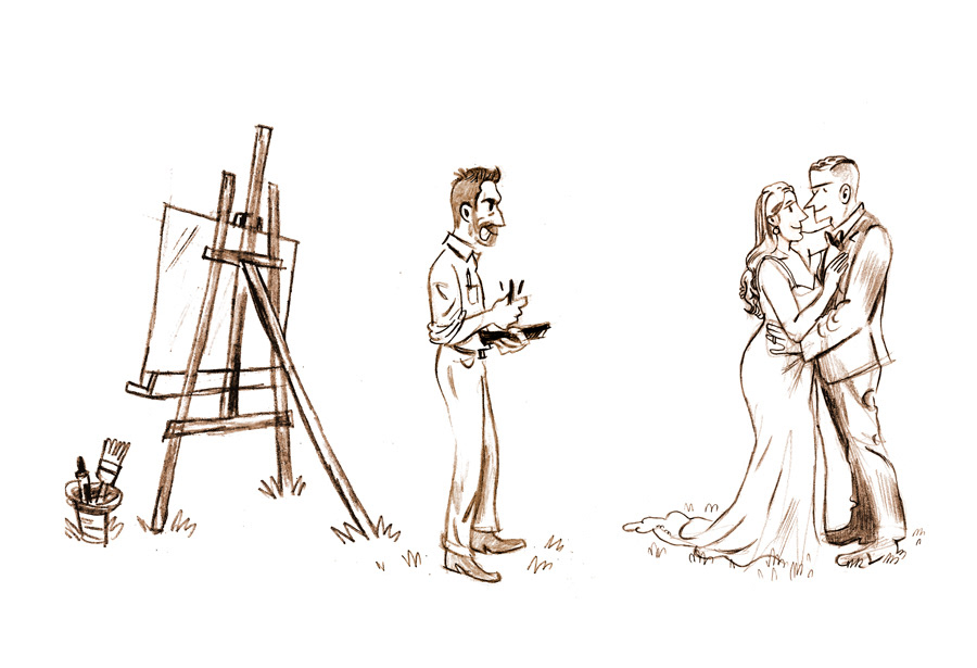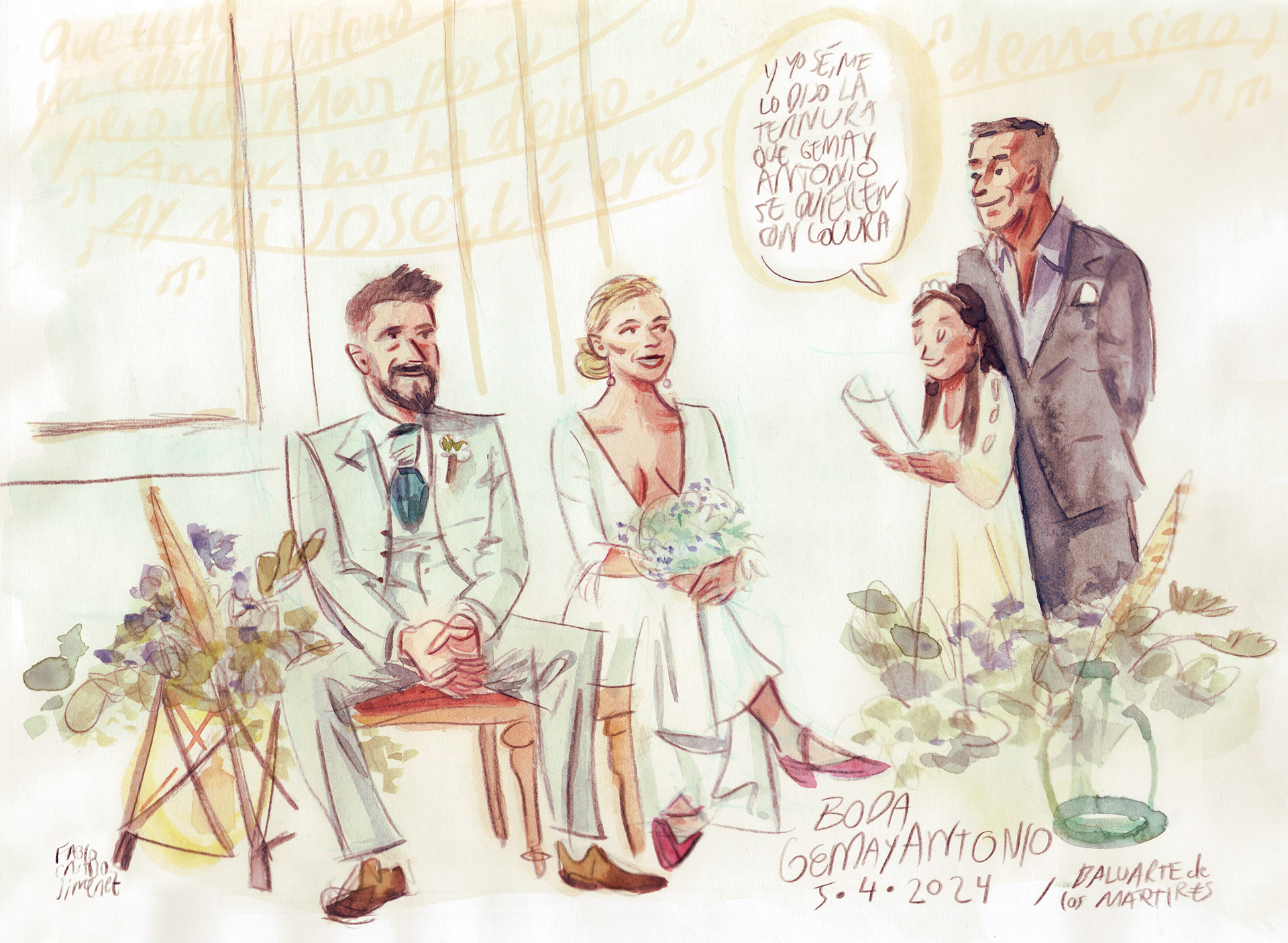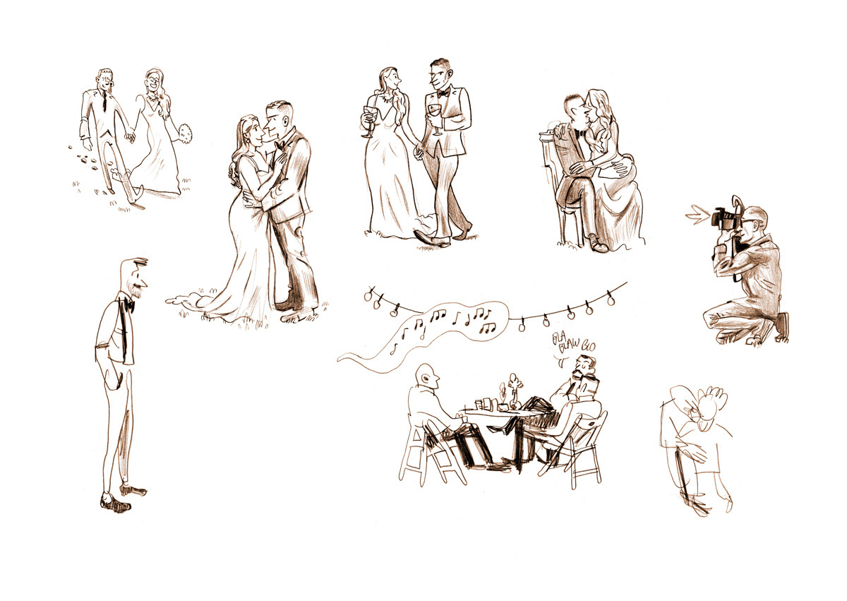 Aquí va un popurrí de mis dibujos y acuarelas de bodas. Cuando el color es a mano en vez de en digital es más difícil que luzcan igual de bien en la pantalla. Por este motivo y porque me resulta más fácil probar y corregir colores, entonación y luces en Photoshop, prefiero el medio digital. Sin embargo, muchas veces surge por petición del cliente o porque me lo pide la situación. Muchas bodas que dibujo son regalos originales que hago a mis familiares, en los que disfruto de hacerlo sin compromiso y en los que me permito experimentar con rotuladores, lápices de color o acuarelas, según me apetezca personalmente.