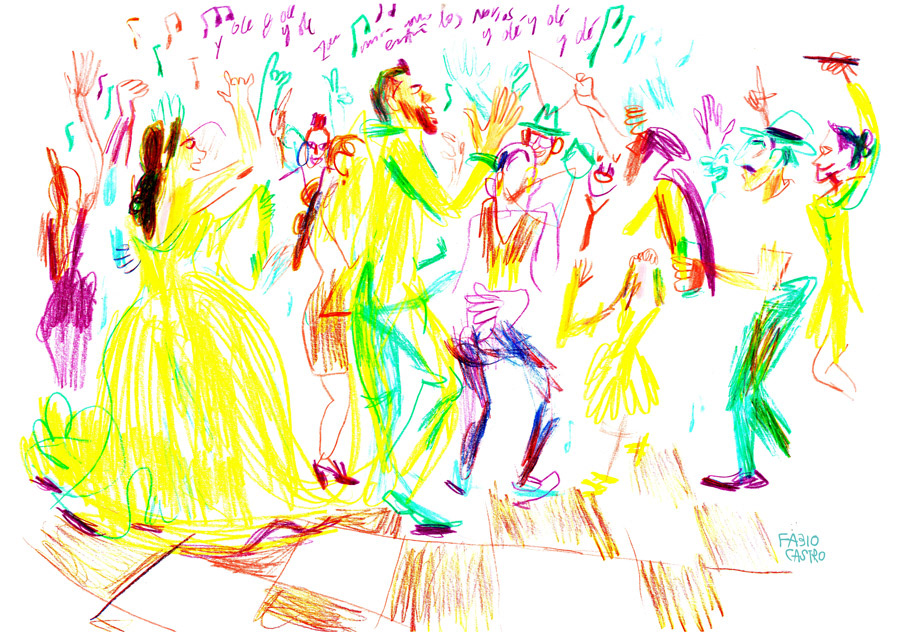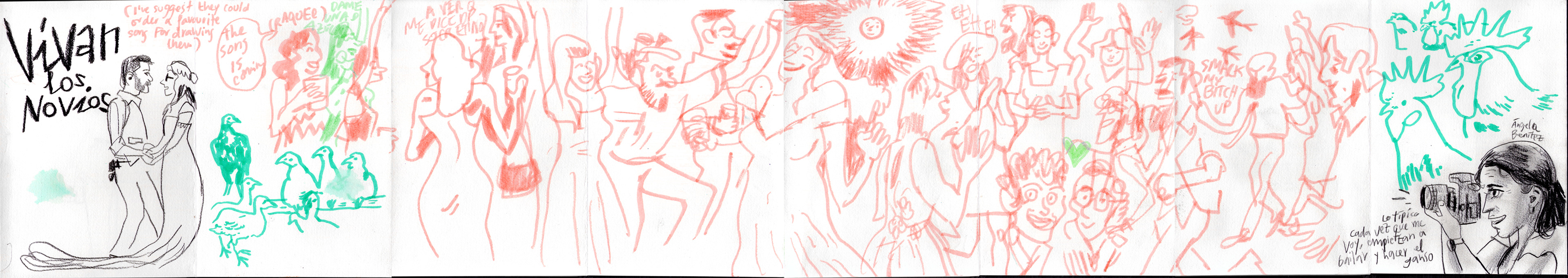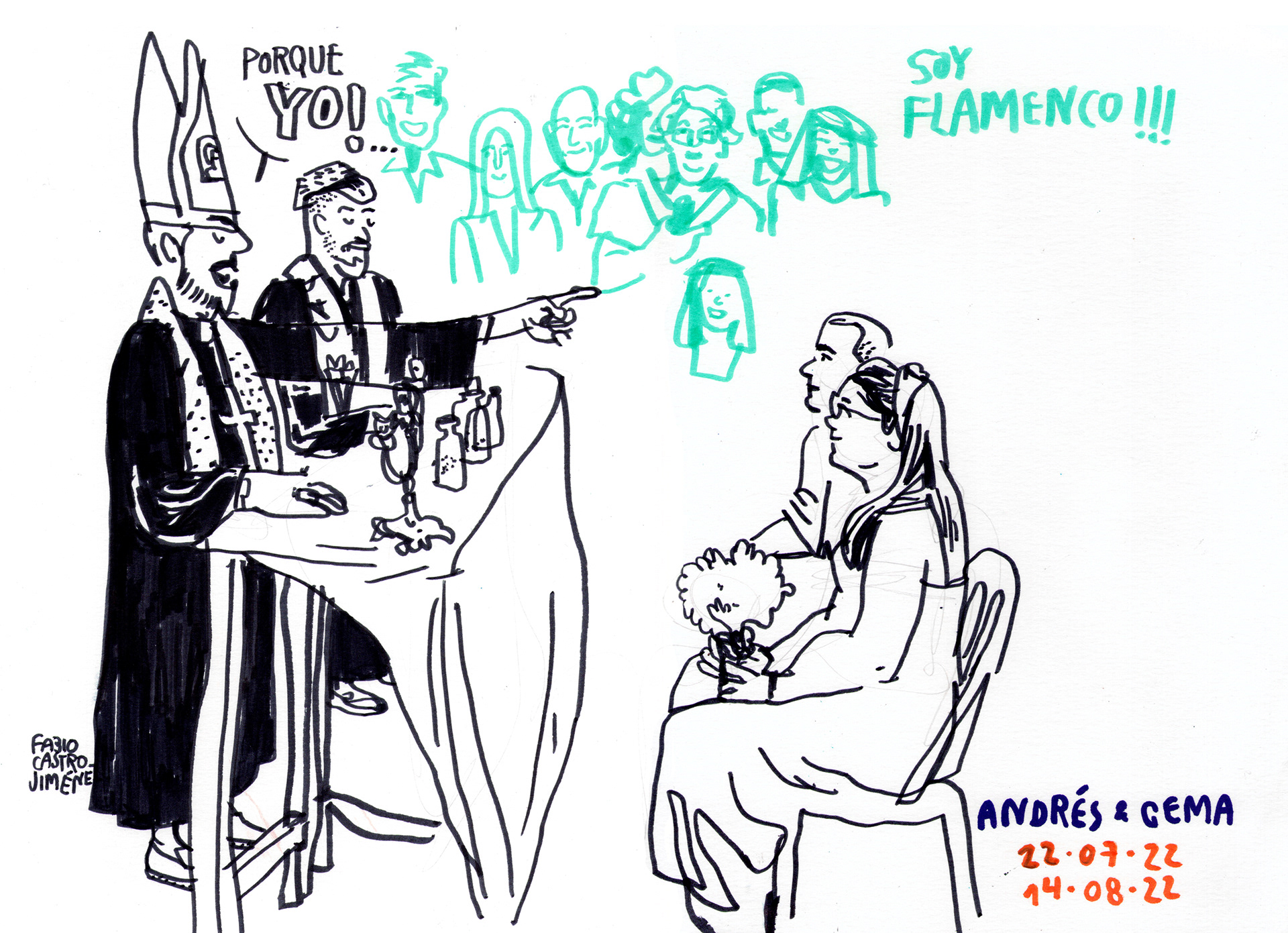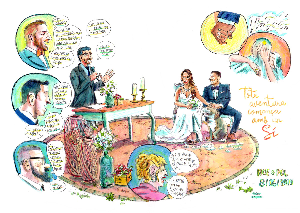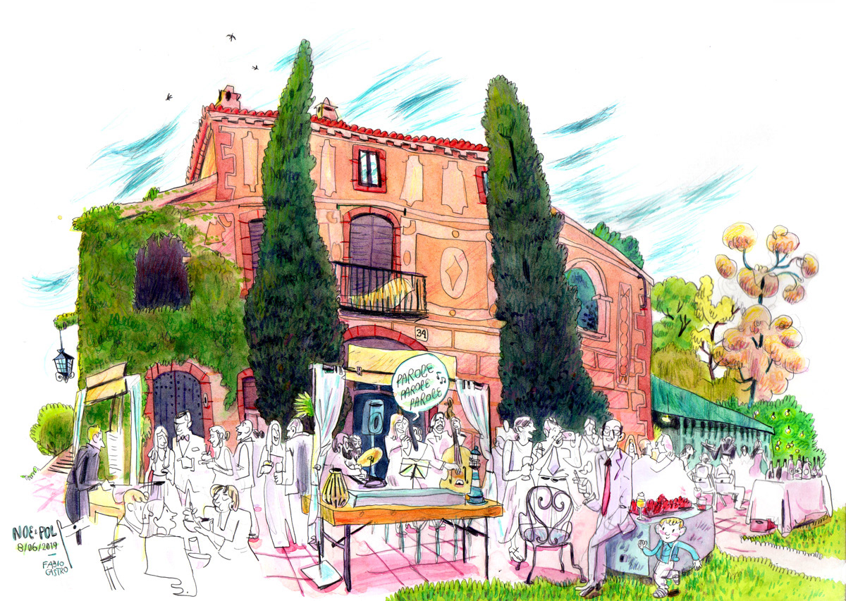 Aquí va un popurrí de mis dibujos y acuarelas de bodas. Cuando el color es a mano en vez de en digital es más difícil que luzcan igual de bien en la pantalla. Por este motivo y porque me resulta más fácil probar y corregir colores, entonación y luces en Photoshop, prefiero el medio digital. Sin embargo, muchas veces surge por petición del cliente o porque me lo pide la situación. Muchas bodas que dibujo son regalos originales que hago a mis familiares, en los que disfruto de hacerlo sin compromiso y en los que me permito experimentar con rotuladores, lápices de color o acuarelas, según me apetezca personalmente.
